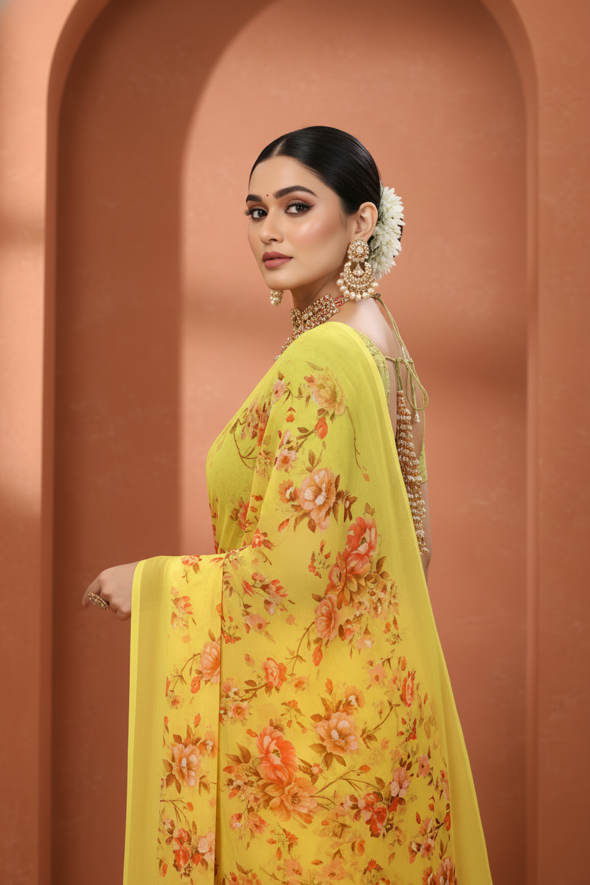 Zamuna Orange Georgette Floral Digital Print Saree with Blouse Piece – Elegant Wedding & Festive Wear