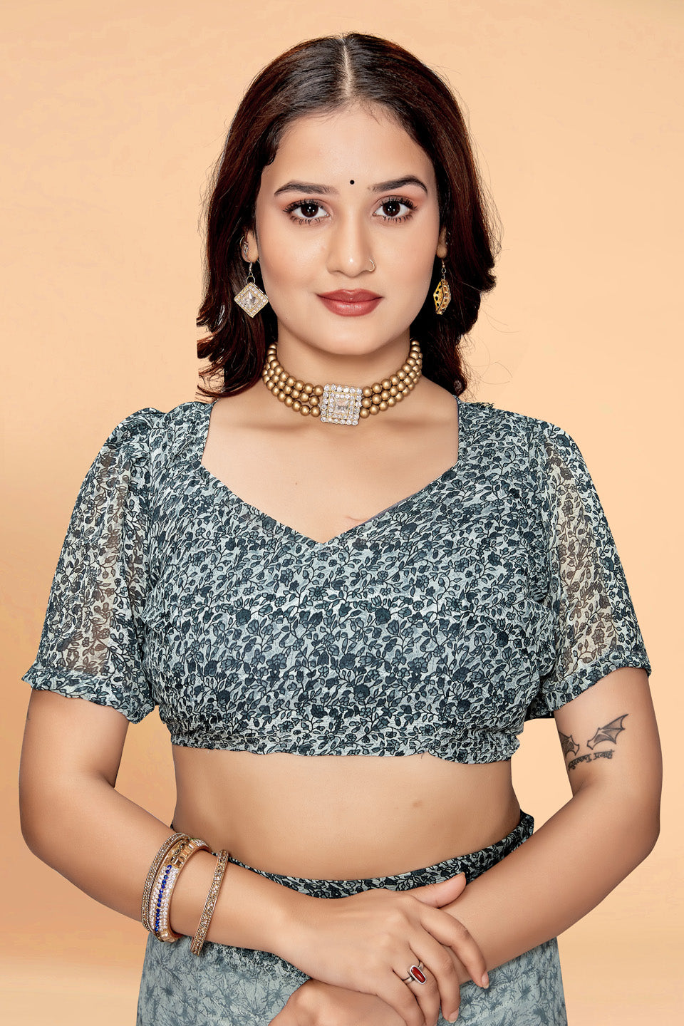 This saree is made with premium Georgette saree fabric, which is soft, airy, and known for its beautiful drape. The pattern is a crisp, clear Digital Print Saree in a modern geometric style. The subtle grey shade is versatile and easy to pair with accessories. It includes a matching fabric piece for the unstitched blouse.