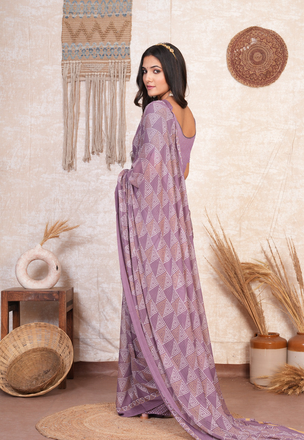 The fabric is high-quality Georgette saree, which is loved for being lightweight, flowy, and very comfortable. The design is a clear, precise Digital Print Saree in a chic geometric style. The subtle lavender shade is incredibly gentle and graceful. It includes a matching fabric piece for the unstitched blouse.