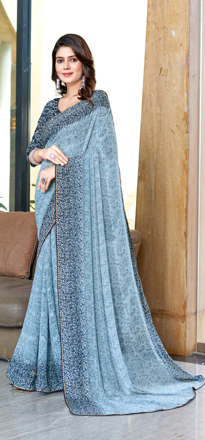 Made from lightweight premium georgette, this saree flows beautifully and offers unmatched comfort for all-day wear. The refreshing light blue hue symbolizes calm sophistication, while the intricate geometric digital prints add a touch of contemporary finesse — perfect for festive occasions, office parties, or casual celebrations.